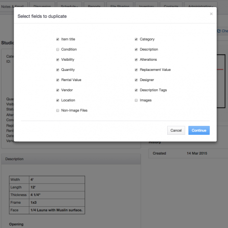 StageStock allows you to inventory new items in a matter of moments. You can add items at your desktop computer or on the go with your smartphone or tablet, adding as little or as much information as you would like. The duplication feature allows you to quickly create a new item based on a similar item or a saved template.